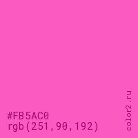Цвет #FB5AC0 в цветовой модели RGB обозначается тремя октетами (251, 90, 192) в десятичном формате и #FB5AC0 в шестнадцатиричном (hex) формате, которые являются интенсивностью красного 251 (hex FB), интенсивность зелёного 90 (hex 5A) и интенсивность синего 192 (hex C0).