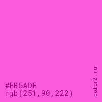 Цвет #FB5ADE в цветовой модели RGB обозначается тремя октетами (251, 90, 222) в десятичном формате и #FB5ADE в шестнадцатиричном (hex) формате, которые являются интенсивностью красного 251 (hex FB), интенсивность зелёного 90 (hex 5A) и интенсивность синего 222 (hex DE).