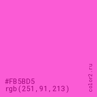 Цвет #FB5BD5 в цветовой модели RGB обозначается тремя октетами (251, 91, 213) в десятичном формате и #FB5BD5 в шестнадцатиричном (hex) формате, которые являются интенсивностью красного 251 (hex FB), интенсивность зелёного 91 (hex 5B) и интенсивность синего 213 (hex D5).