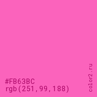 Цвет #FB63BC в цветовой модели RGB обозначается тремя октетами (251, 99, 188) в десятичном формате и #FB63BC в шестнадцатиричном (hex) формате, которые являются интенсивностью красного 251 (hex FB), интенсивность зелёного 99 (hex 63) и интенсивность синего 188 (hex BC).