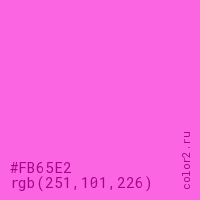 Цвет #FB65E2 в цветовой модели RGB обозначается тремя октетами (251, 101, 226) в десятичном формате и #FB65E2 в шестнадцатиричном (hex) формате, которые являются интенсивностью красного 251 (hex FB), интенсивность зелёного 101 (hex 65) и интенсивность синего 226 (hex E2).