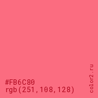 Цвет #FB6C80 в цветовой модели RGB обозначается тремя октетами (251, 108, 128) в десятичном формате и #FB6C80 в шестнадцатиричном (hex) формате, которые являются интенсивностью красного 251 (hex FB), интенсивность зелёного 108 (hex 6C) и интенсивность синего 128 (hex 80).