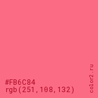 Цвет #FB6C84 в цветовой модели RGB обозначается тремя октетами (251, 108, 132) в десятичном формате и #FB6C84 в шестнадцатиричном (hex) формате, которые являются интенсивностью красного 251 (hex FB), интенсивность зелёного 108 (hex 6C) и интенсивность синего 132 (hex 84).