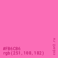 Цвет #FB6CB6 в цветовой модели RGB обозначается тремя октетами (251, 108, 182) в десятичном формате и #FB6CB6 в шестнадцатиричном (hex) формате, которые являются интенсивностью красного 251 (hex FB), интенсивность зелёного 108 (hex 6C) и интенсивность синего 182 (hex B6).