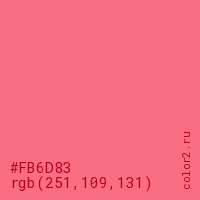 Цвет #FB6D83 в цветовой модели RGB обозначается тремя октетами (251, 109, 131) в десятичном формате и #FB6D83 в шестнадцатиричном (hex) формате, которые являются интенсивностью красного 251 (hex FB), интенсивность зелёного 109 (hex 6D) и интенсивность синего 131 (hex 83).