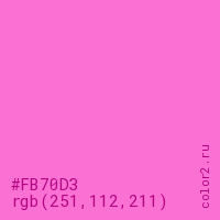 Цвет #FB70D3 в цветовой модели RGB обозначается тремя октетами (251, 112, 211) в десятичном формате и #FB70D3 в шестнадцатиричном (hex) формате, которые являются интенсивностью красного 251 (hex FB), интенсивность зелёного 112 (hex 70) и интенсивность синего 211 (hex D3).