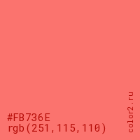 Цвет #FB736E в цветовой модели RGB обозначается тремя октетами (251, 115, 110) в десятичном формате и #FB736E в шестнадцатиричном (hex) формате, которые являются интенсивностью красного 251 (hex FB), интенсивность зелёного 115 (hex 73) и интенсивность синего 110 (hex 6E).