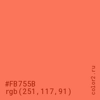 Цвет #FB755B в цветовой модели RGB обозначается тремя октетами (251, 117, 91) в десятичном формате и #FB755B в шестнадцатиричном (hex) формате, которые являются интенсивностью красного 251 (hex FB), интенсивность зелёного 117 (hex 75) и интенсивность синего 91 (hex 5B).