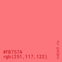Цвет #FB757A в цветовой модели RGB обозначается тремя октетами (251, 117, 122) в десятичном формате и #FB757A в шестнадцатиричном (hex) формате, которые являются интенсивностью красного 251 (hex FB), интенсивность зелёного 117 (hex 75) и интенсивность синего 122 (hex 7A).