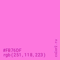 Цвет #FB76DF в цветовой модели RGB обозначается тремя октетами (251, 118, 223) в десятичном формате и #FB76DF в шестнадцатиричном (hex) формате, которые являются интенсивностью красного 251 (hex FB), интенсивность зелёного 118 (hex 76) и интенсивность синего 223 (hex DF).
