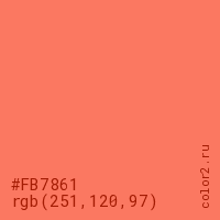 Цвет #FB7861 в цветовой модели RGB обозначается тремя октетами (251, 120, 97) в десятичном формате и #FB7861 в шестнадцатиричном (hex) формате, которые являются интенсивностью красного 251 (hex FB), интенсивность зелёного 120 (hex 78) и интенсивность синего 97 (hex 61).