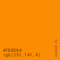 Цвет #FB8D04 в цветовой модели RGB обозначается тремя октетами (251, 141, 4) в десятичном формате и #FB8D04 в шестнадцатиричном (hex) формате, которые являются интенсивностью красного 251 (hex FB), интенсивность зелёного 141 (hex 8D) и интенсивность синего 4 (hex 04).