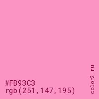 Цвет #FB93C3 в цветовой модели RGB обозначается тремя октетами (251, 147, 195) в десятичном формате и #FB93C3 в шестнадцатиричном (hex) формате, которые являются интенсивностью красного 251 (hex FB), интенсивность зелёного 147 (hex 93) и интенсивность синего 195 (hex C3).