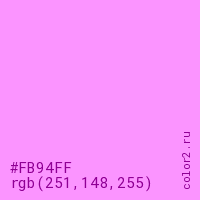 Цвет #FB94FF в цветовой модели RGB обозначается тремя октетами (251, 148, 255) в десятичном формате и #FB94FF в шестнадцатиричном (hex) формате, которые являются интенсивностью красного 251 (hex FB), интенсивность зелёного 148 (hex 94) и интенсивность синего 255 (hex FF).