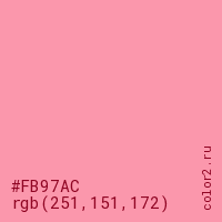 Цвет #FB97AC в цветовой модели RGB обозначается тремя октетами (251, 151, 172) в десятичном формате и #FB97AC в шестнадцатиричном (hex) формате, которые являются интенсивностью красного 251 (hex FB), интенсивность зелёного 151 (hex 97) и интенсивность синего 172 (hex AC).