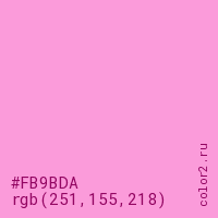 Цвет #FB9BDA в цветовой модели RGB обозначается тремя октетами (251, 155, 218) в десятичном формате и #FB9BDA в шестнадцатиричном (hex) формате, которые являются интенсивностью красного 251 (hex FB), интенсивность зелёного 155 (hex 9B) и интенсивность синего 218 (hex DA).