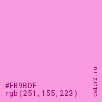 Цвет #FB9BDF в цветовой модели RGB обозначается тремя октетами (251, 155, 223) в десятичном формате и #FB9BDF в шестнадцатиричном (hex) формате, которые являются интенсивностью красного 251 (hex FB), интенсивность зелёного 155 (hex 9B) и интенсивность синего 223 (hex DF).