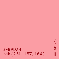 Цвет #FB9DA4 в цветовой модели RGB обозначается тремя октетами (251, 157, 164) в десятичном формате и #FB9DA4 в шестнадцатиричном (hex) формате, которые являются интенсивностью красного 251 (hex FB), интенсивность зелёного 157 (hex 9D) и интенсивность синего 164 (hex A4).
