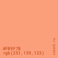 Цвет #FB9F7B в цветовой модели RGB обозначается тремя октетами (251, 159, 123) в десятичном формате и #FB9F7B в шестнадцатиричном (hex) формате, которые являются интенсивностью красного 251 (hex FB), интенсивность зелёного 159 (hex 9F) и интенсивность синего 123 (hex 7B).