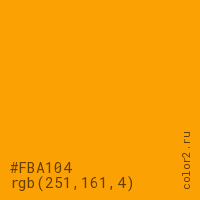 Цвет #FBA104 в цветовой модели RGB обозначается тремя октетами (251, 161, 4) в десятичном формате и #FBA104 в шестнадцатиричном (hex) формате, которые являются интенсивностью красного 251 (hex FB), интенсивность зелёного 161 (hex A1) и интенсивность синего 4 (hex 04).