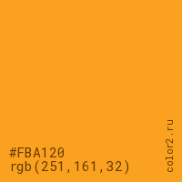 Цвет #FBA120 в цветовой модели RGB обозначается тремя октетами (251, 161, 32) в десятичном формате и #FBA120 в шестнадцатиричном (hex) формате, которые являются интенсивностью красного 251 (hex FB), интенсивность зелёного 161 (hex A1) и интенсивность синего 32 (hex 20).