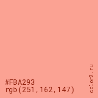 Цвет #FBA293 в цветовой модели RGB обозначается тремя октетами (251, 162, 147) в десятичном формате и #FBA293 в шестнадцатиричном (hex) формате, которые являются интенсивностью красного 251 (hex FB), интенсивность зелёного 162 (hex A2) и интенсивность синего 147 (hex 93).