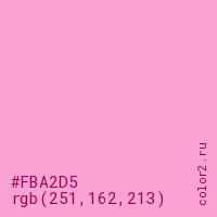 Цвет #FBA2D5 в цветовой модели RGB обозначается тремя октетами (251, 162, 213) в десятичном формате и #FBA2D5 в шестнадцатиричном (hex) формате, которые являются интенсивностью красного 251 (hex FB), интенсивность зелёного 162 (hex A2) и интенсивность синего 213 (hex D5).