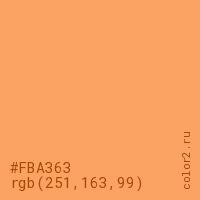 Цвет #FBA363 в цветовой модели RGB обозначается тремя октетами (251, 163, 99) в десятичном формате и #FBA363 в шестнадцатиричном (hex) формате, которые являются интенсивностью красного 251 (hex FB), интенсивность зелёного 163 (hex A3) и интенсивность синего 99 (hex 63).