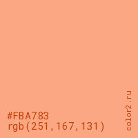Цвет #FBA783 в цветовой модели RGB обозначается тремя октетами (251, 167, 131) в десятичном формате и #FBA783 в шестнадцатиричном (hex) формате, которые являются интенсивностью красного 251 (hex FB), интенсивность зелёного 167 (hex A7) и интенсивность синего 131 (hex 83).