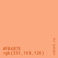 Цвет #FBA87E в цветовой модели RGB обозначается тремя октетами (251, 168, 126) в десятичном формате и #FBA87E в шестнадцатиричном (hex) формате, которые являются интенсивностью красного 251 (hex FB), интенсивность зелёного 168 (hex A8) и интенсивность синего 126 (hex 7E).