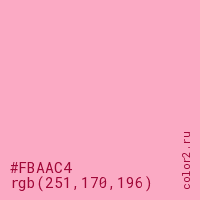 Цвет #FBAAC4 в цветовой модели RGB обозначается тремя октетами (251, 170, 196) в десятичном формате и #FBAAC4 в шестнадцатиричном (hex) формате, которые являются интенсивностью красного 251 (hex FB), интенсивность зелёного 170 (hex AA) и интенсивность синего 196 (hex C4).