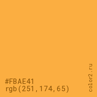Цвет #FBAE41 в цветовой модели RGB обозначается тремя октетами (251, 174, 65) в десятичном формате и #FBAE41 в шестнадцатиричном (hex) формате, которые являются интенсивностью красного 251 (hex FB), интенсивность зелёного 174 (hex AE) и интенсивность синего 65 (hex 41).