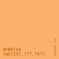 Цвет #FBB16B в цветовой модели RGB обозначается тремя октетами (251, 177, 107) в десятичном формате и #FBB16B в шестнадцатиричном (hex) формате, которые являются интенсивностью красного 251 (hex FB), интенсивность зелёного 177 (hex B1) и интенсивность синего 107 (hex 6B).