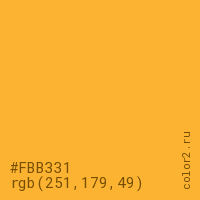 Цвет #FBB331 в цветовой модели RGB обозначается тремя октетами (251, 179, 49) в десятичном формате и #FBB331 в шестнадцатиричном (hex) формате, которые являются интенсивностью красного 251 (hex FB), интенсивность зелёного 179 (hex B3) и интенсивность синего 49 (hex 31).