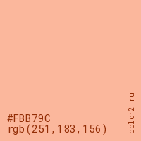 Цвет #FBB79C в цветовой модели RGB обозначается тремя октетами (251, 183, 156) в десятичном формате и #FBB79C в шестнадцатиричном (hex) формате, которые являются интенсивностью красного 251 (hex FB), интенсивность зелёного 183 (hex B7) и интенсивность синего 156 (hex 9C).