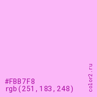 Цвет #FBB7F8 в цветовой модели RGB обозначается тремя октетами (251, 183, 248) в десятичном формате и #FBB7F8 в шестнадцатиричном (hex) формате, которые являются интенсивностью красного 251 (hex FB), интенсивность зелёного 183 (hex B7) и интенсивность синего 248 (hex F8).