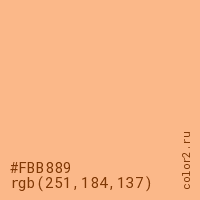 Цвет #FBB889 в цветовой модели RGB обозначается тремя октетами (251, 184, 137) в десятичном формате и #FBB889 в шестнадцатиричном (hex) формате, которые являются интенсивностью красного 251 (hex FB), интенсивность зелёного 184 (hex B8) и интенсивность синего 137 (hex 89).
