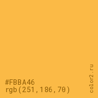 Цвет #FBBA46 в цветовой модели RGB обозначается тремя октетами (251, 186, 70) в десятичном формате и #FBBA46 в шестнадцатиричном (hex) формате, которые являются интенсивностью красного 251 (hex FB), интенсивность зелёного 186 (hex BA) и интенсивность синего 70 (hex 46).