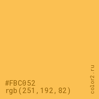 Цвет #FBC052 в цветовой модели RGB обозначается тремя октетами (251, 192, 82) в десятичном формате и #FBC052 в шестнадцатиричном (hex) формате, которые являются интенсивностью красного 251 (hex FB), интенсивность зелёного 192 (hex C0) и интенсивность синего 82 (hex 52).