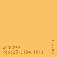 Цвет #FBC265 в цветовой модели RGB обозначается тремя октетами (251, 194, 101) в десятичном формате и #FBC265 в шестнадцатиричном (hex) формате, которые являются интенсивностью красного 251 (hex FB), интенсивность зелёного 194 (hex C2) и интенсивность синего 101 (hex 65).