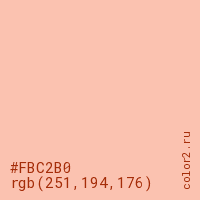 Цвет #FBC2B0 в цветовой модели RGB обозначается тремя октетами (251, 194, 176) в десятичном формате и #FBC2B0 в шестнадцатиричном (hex) формате, которые являются интенсивностью красного 251 (hex FB), интенсивность зелёного 194 (hex C2) и интенсивность синего 176 (hex B0).
