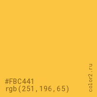Цвет #FBC441 в цветовой модели RGB обозначается тремя октетами (251, 196, 65) в десятичном формате и #FBC441 в шестнадцатиричном (hex) формате, которые являются интенсивностью красного 251 (hex FB), интенсивность зелёного 196 (hex C4) и интенсивность синего 65 (hex 41).