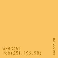 Цвет #FBC462 в цветовой модели RGB обозначается тремя октетами (251, 196, 98) в десятичном формате и #FBC462 в шестнадцатиричном (hex) формате, которые являются интенсивностью красного 251 (hex FB), интенсивность зелёного 196 (hex C4) и интенсивность синего 98 (hex 62).