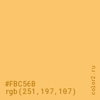 Цвет #FBC56B в цветовой модели RGB обозначается тремя октетами (251, 197, 107) в десятичном формате и #FBC56B в шестнадцатиричном (hex) формате, которые являются интенсивностью красного 251 (hex FB), интенсивность зелёного 197 (hex C5) и интенсивность синего 107 (hex 6B).