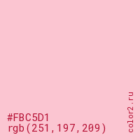 Цвет #FBC5D1 в цветовой модели RGB обозначается тремя октетами (251, 197, 209) в десятичном формате и #FBC5D1 в шестнадцатиричном (hex) формате, которые являются интенсивностью красного 251 (hex FB), интенсивность зелёного 197 (hex C5) и интенсивность синего 209 (hex D1).