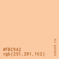 Цвет #FBC9A2 в цветовой модели RGB обозначается тремя октетами (251, 201, 162) в десятичном формате и #FBC9A2 в шестнадцатиричном (hex) формате, которые являются интенсивностью красного 251 (hex FB), интенсивность зелёного 201 (hex C9) и интенсивность синего 162 (hex A2).