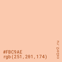 Цвет #FBC9AE в цветовой модели RGB обозначается тремя октетами (251, 201, 174) в десятичном формате и #FBC9AE в шестнадцатиричном (hex) формате, которые являются интенсивностью красного 251 (hex FB), интенсивность зелёного 201 (hex C9) и интенсивность синего 174 (hex AE).