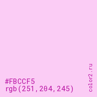 Цвет #FBCCF5 в цветовой модели RGB обозначается тремя октетами (251, 204, 245) в десятичном формате и #FBCCF5 в шестнадцатиричном (hex) формате, которые являются интенсивностью красного 251 (hex FB), интенсивность зелёного 204 (hex CC) и интенсивность синего 245 (hex F5).