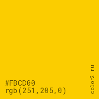 Цвет #FBCD00 в цветовой модели RGB обозначается тремя октетами (251, 205, 0) в десятичном формате и #FBCD00 в шестнадцатиричном (hex) формате, которые являются интенсивностью красного 251 (hex FB), интенсивность зелёного 205 (hex CD) и интенсивность синего 0 (hex 00).