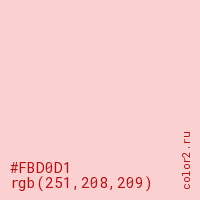 Цвет #FBD0D1 в цветовой модели RGB обозначается тремя октетами (251, 208, 209) в десятичном формате и #FBD0D1 в шестнадцатиричном (hex) формате, которые являются интенсивностью красного 251 (hex FB), интенсивность зелёного 208 (hex D0) и интенсивность синего 209 (hex D1).